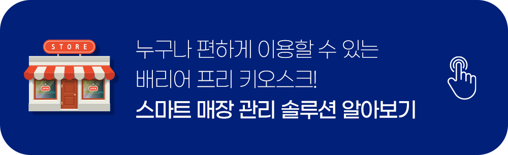 정부는 소상공인의 부담을 덜기 위해 마련하고 있는 다양한 정책들 중 하나로, 소상공인 사업장에 스마트 기술을 지원하는 스마트상점 기술 보급 사업이 있습니다. 스마트상점 기술 보급 사업을 통해 배리어프리 키오스크 도입을 위한 지원을 받을 수 있기에 소상공인의 경제적 부담을 덜 수 있게 되었죠.